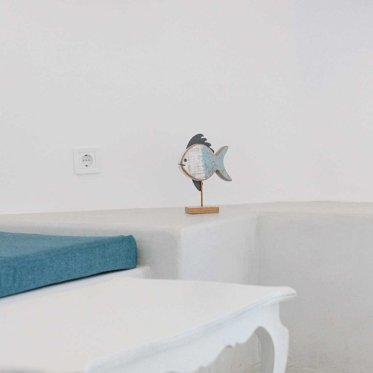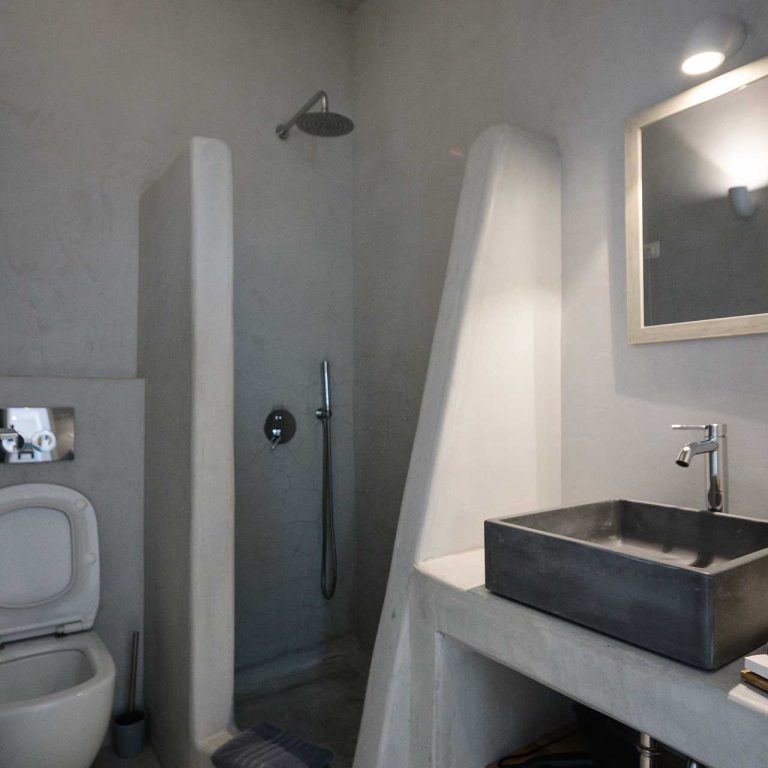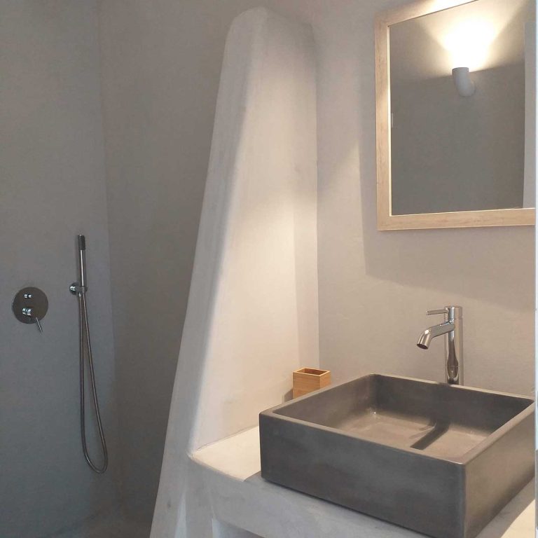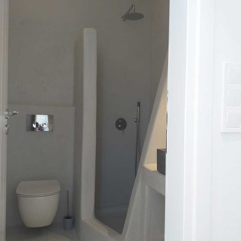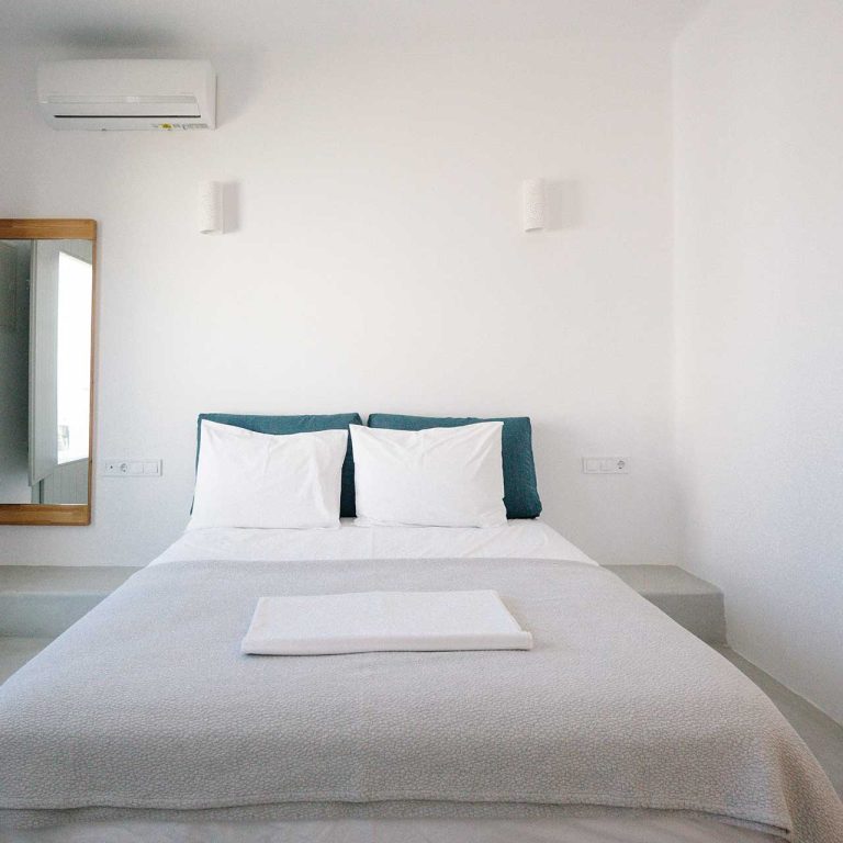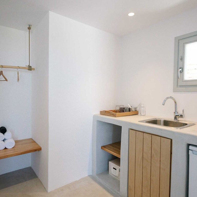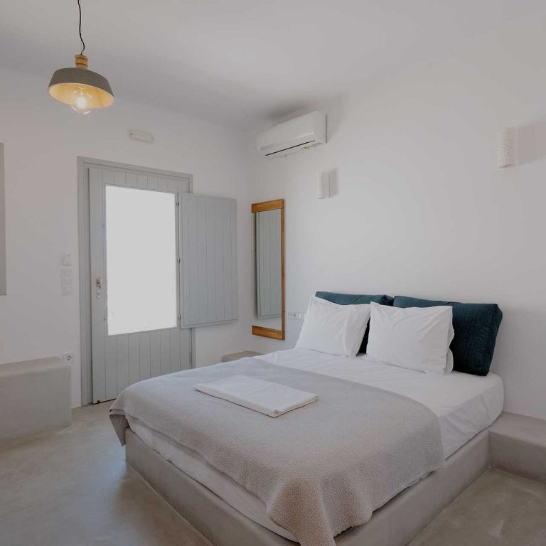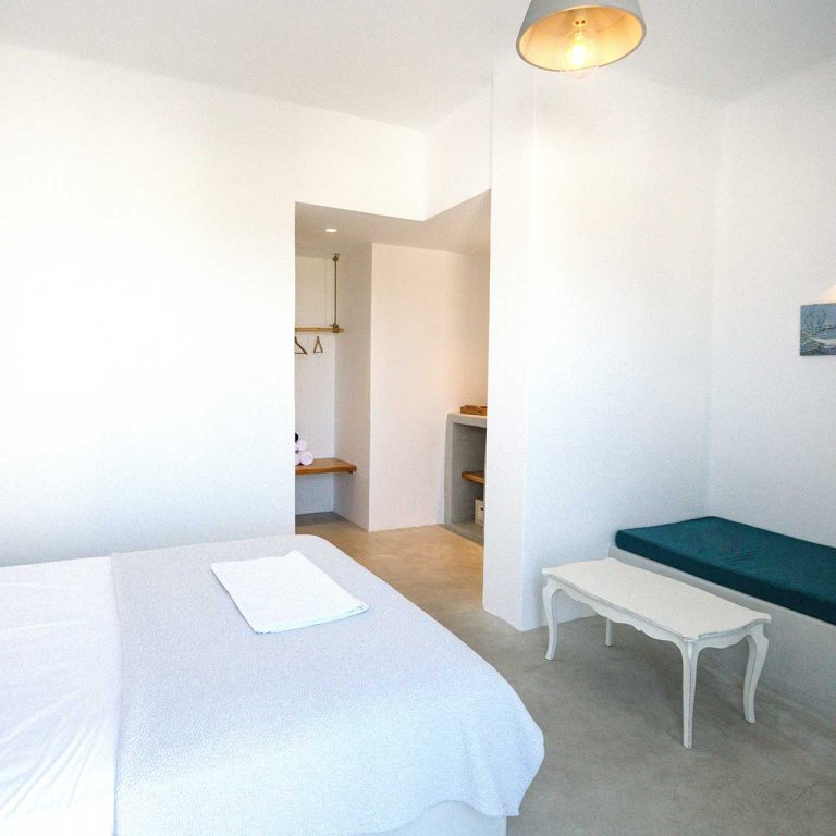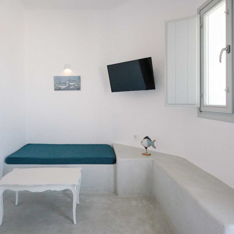 25m2 suite (with bedroom and living room) on different levels. Built in furniture, bathroom with shower, private veranda with a view of the traditional settlement Chora of Ios, the sea, or the pool.