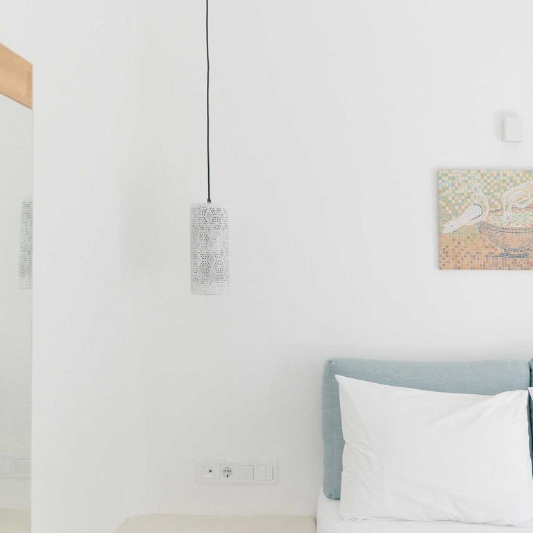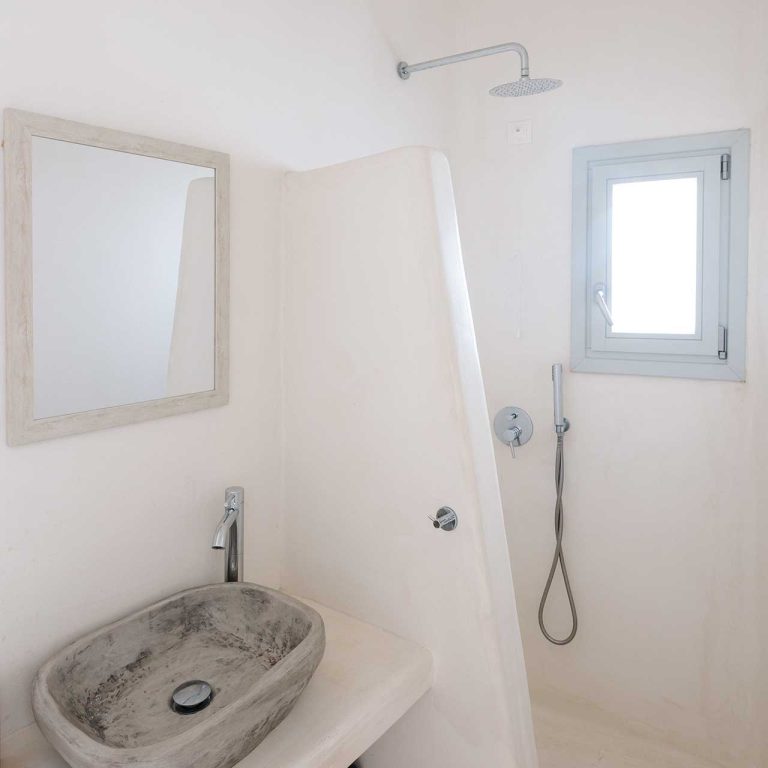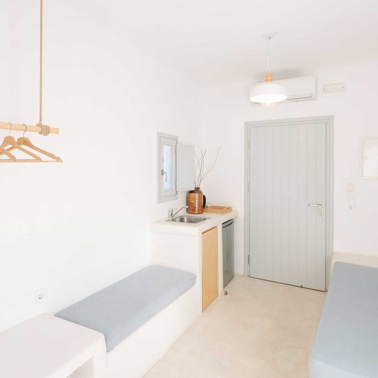 25μ2 suite (with bedroom and living room) on different levels. Built in furniture, bathroom with shower, private veranda with a view of the traditional settlement Chora of Ios, the sea, or the pool.