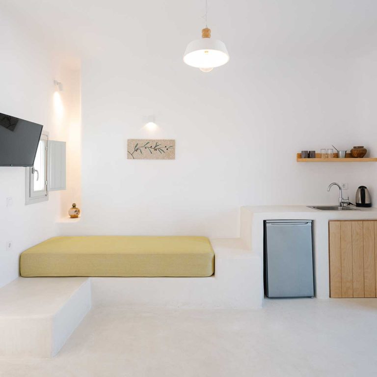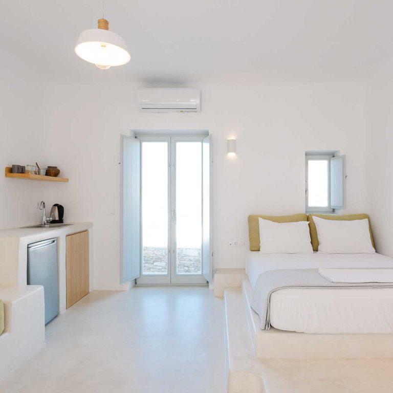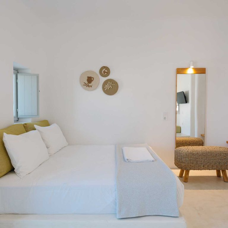 27m2 suite (with bedroom and living room) on different levels. Built in furniture, bathroom with shower, private veranda with a view of the traditional settlement Chora of Ios, the sea, or the pool.