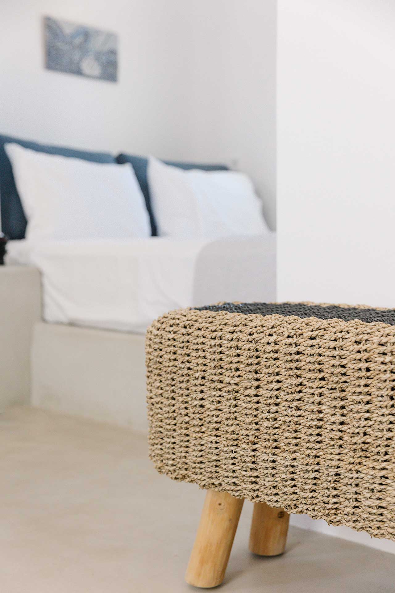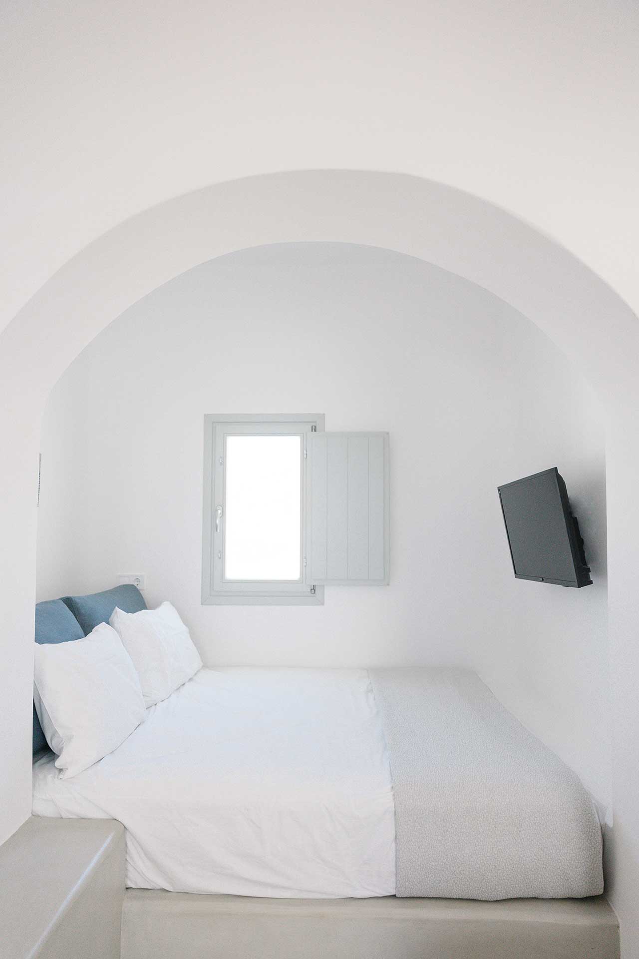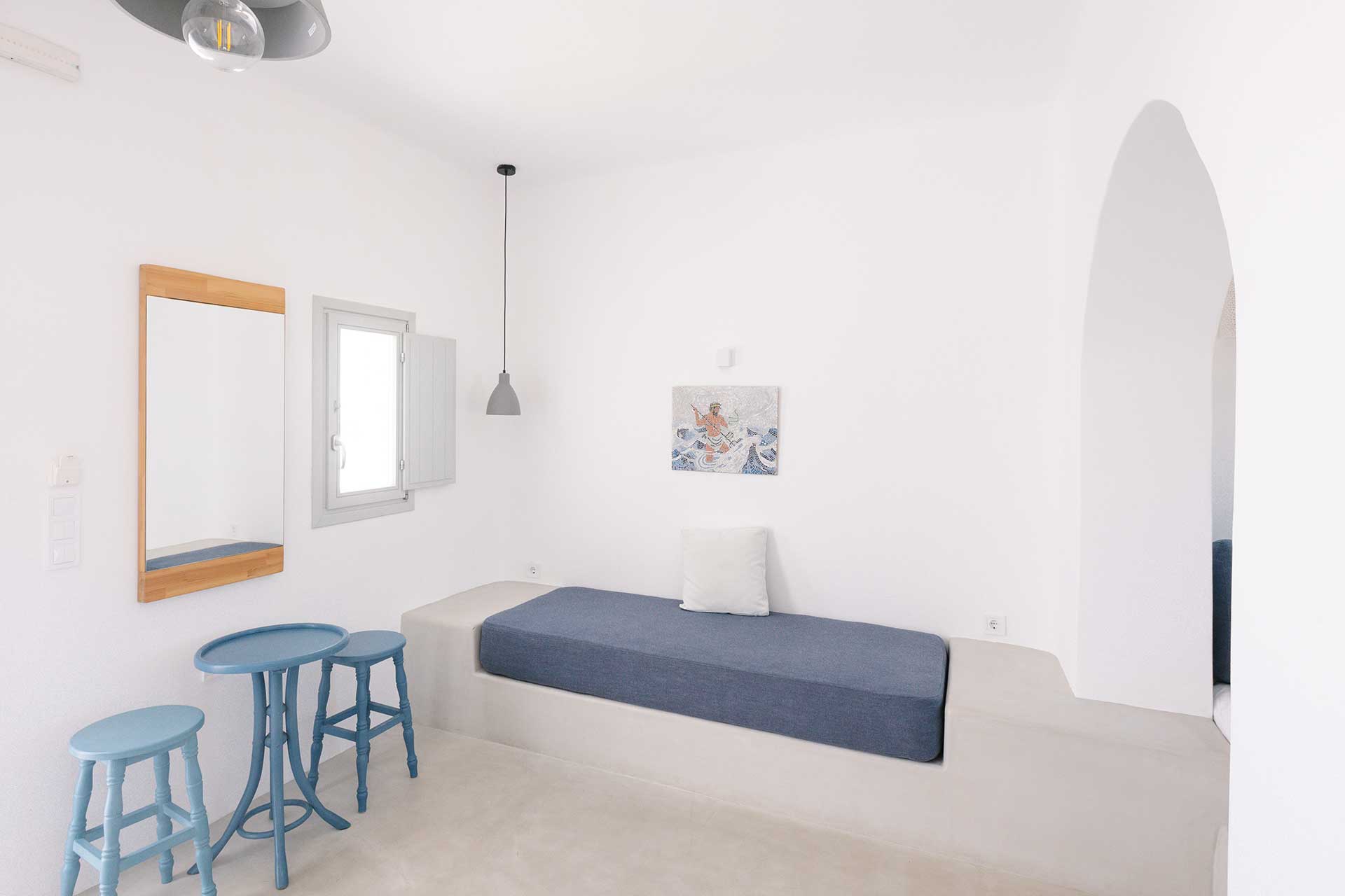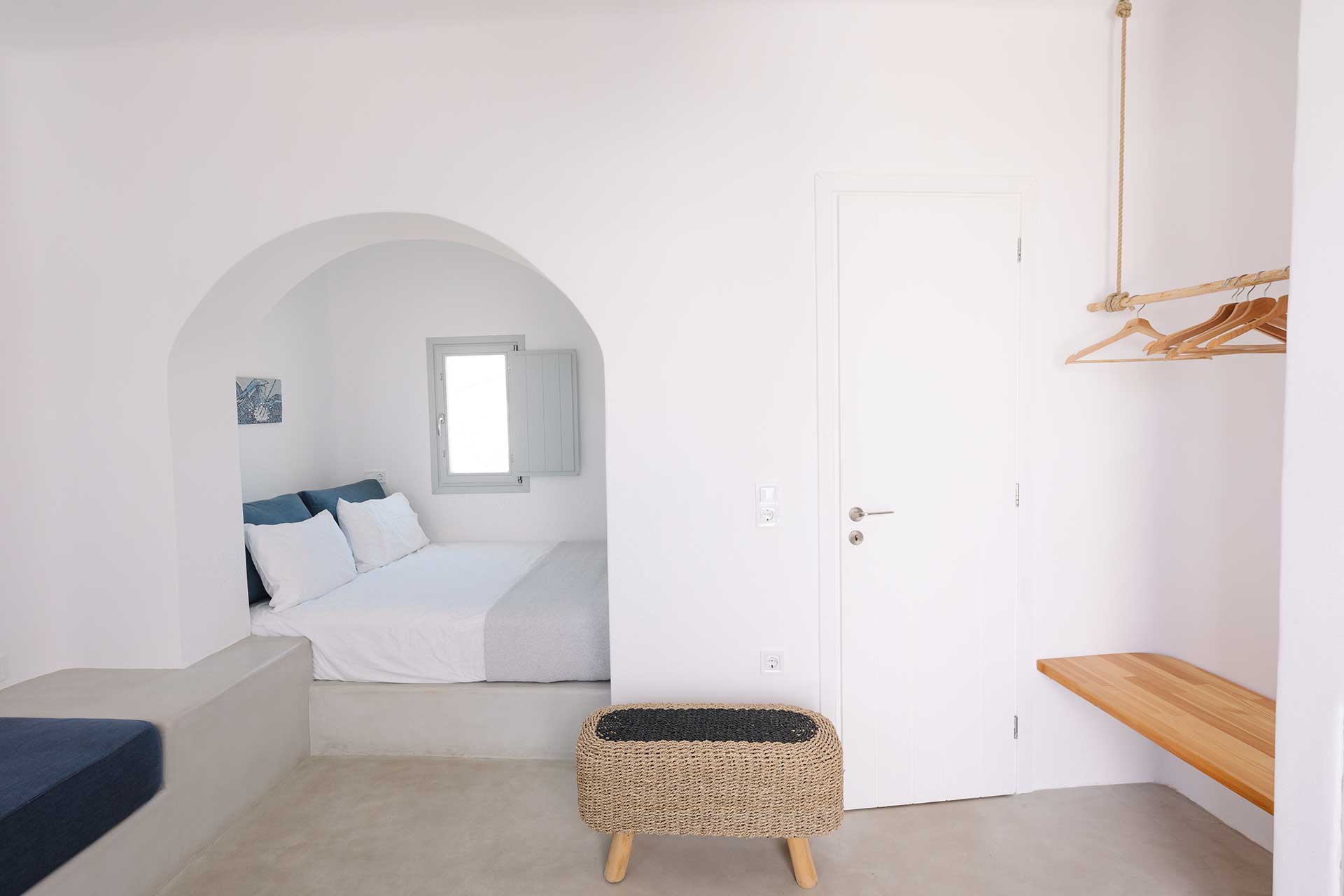 25μ2 suite (with bedroom and living room) on different levels. Built in furniture, bathroom with shower, private veranda with a view of the traditional settlement Chora of Ios, the sea, or the pool.