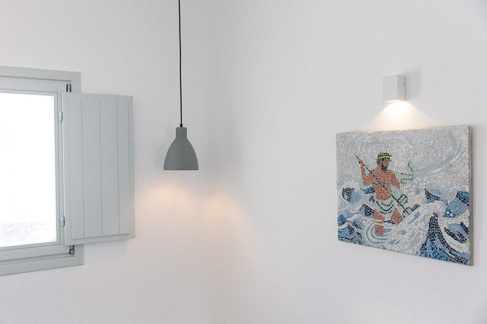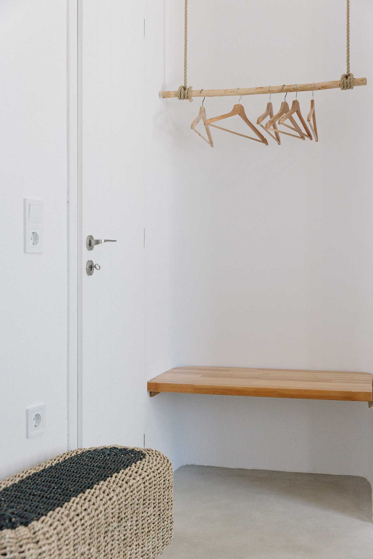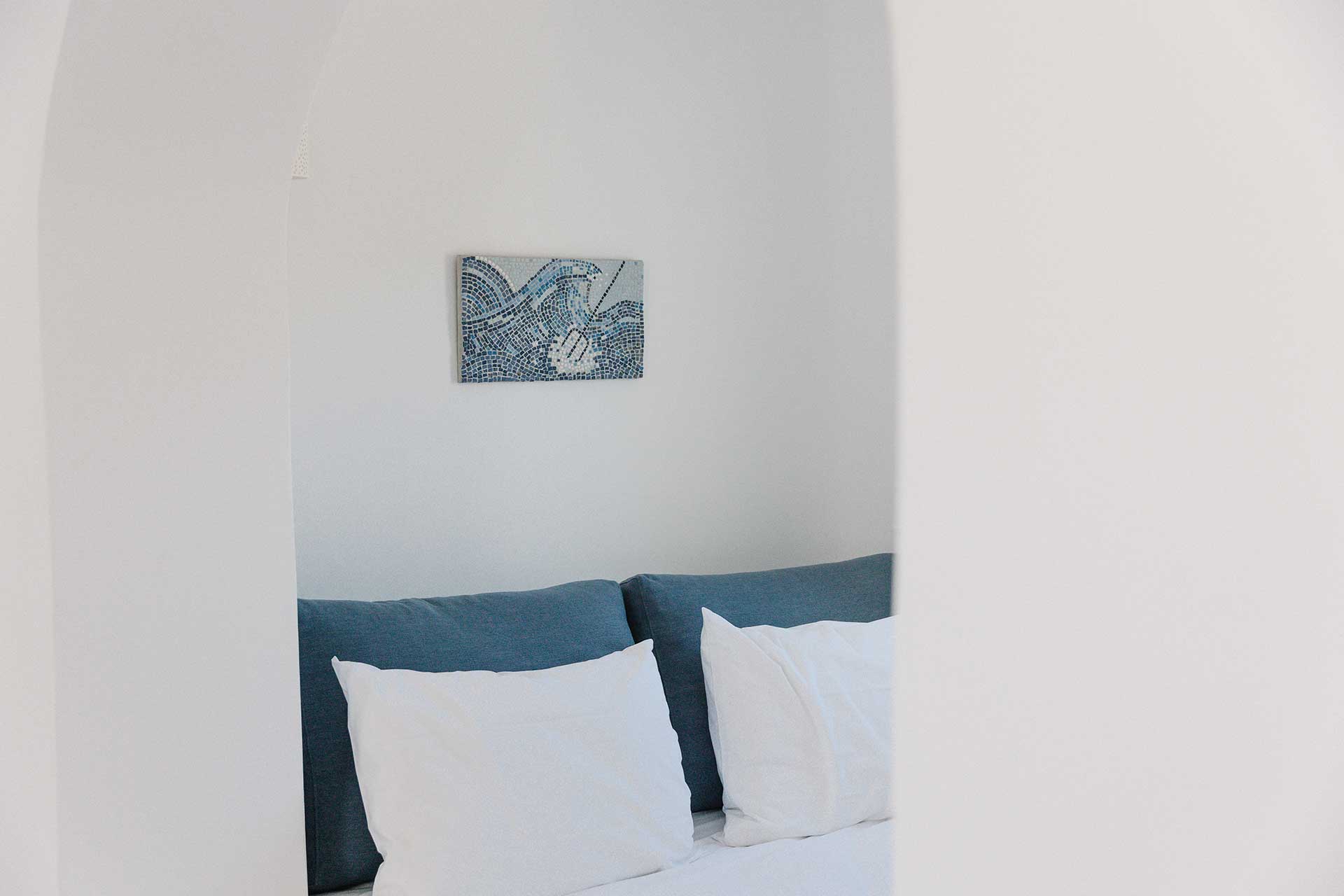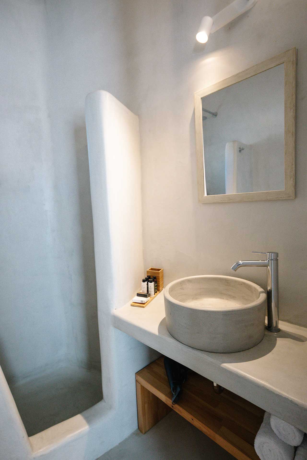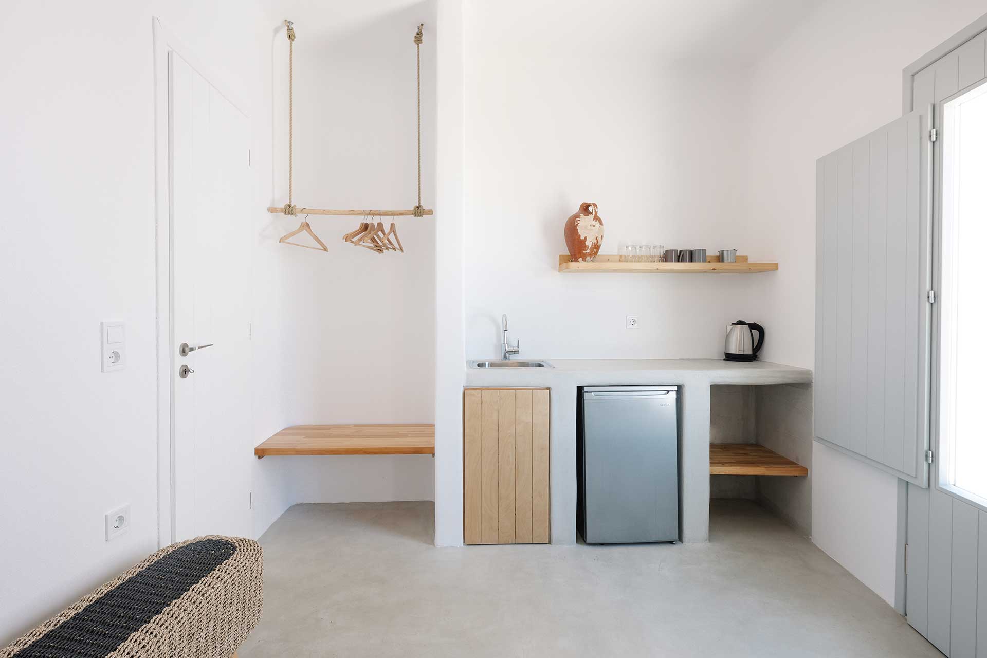 25μ2 suite (with bedroom and living room) on different levels. Built in furniture, bathroom with shower, private veranda with a view of the traditional settlement Chora of Ios, the sea, or the pool.