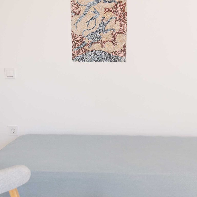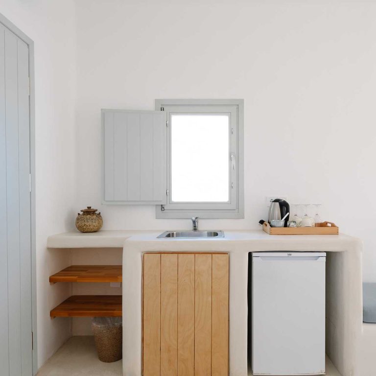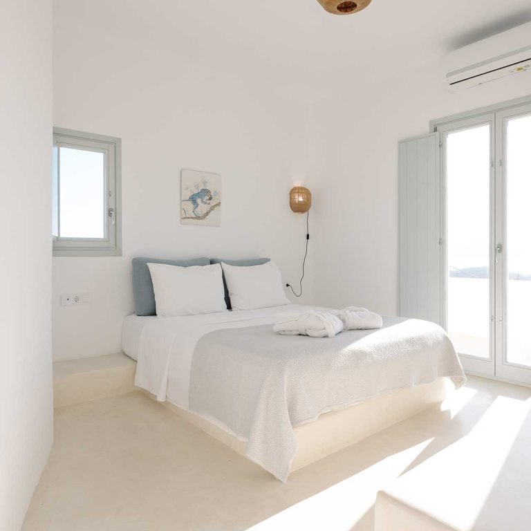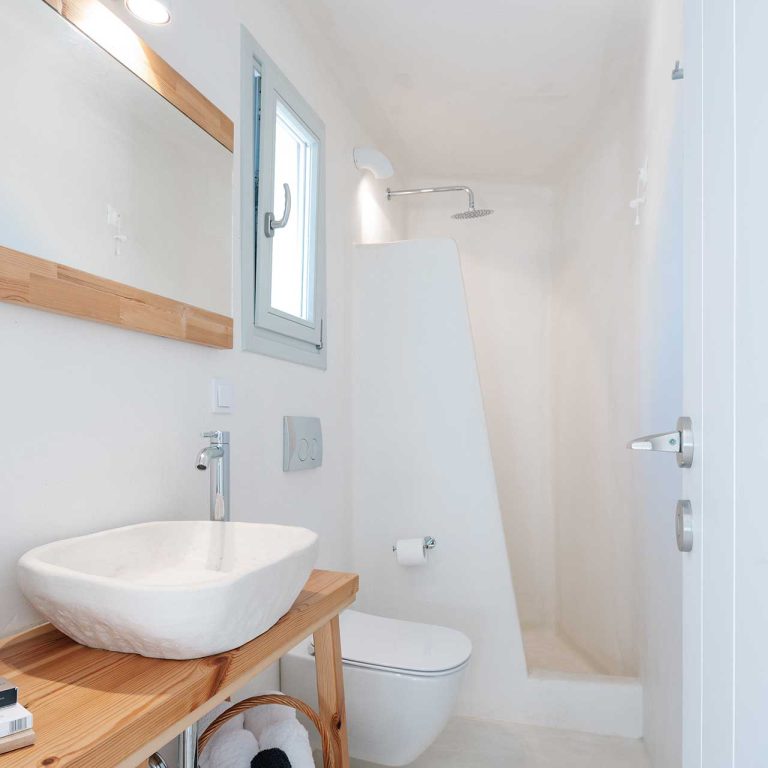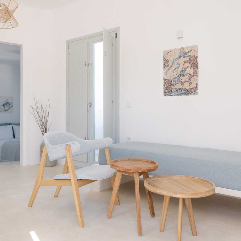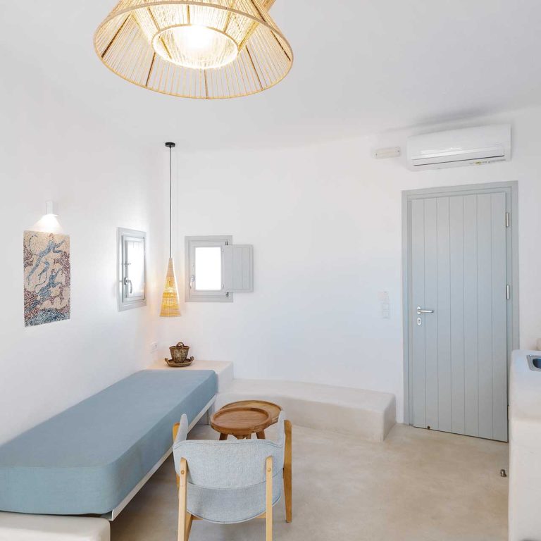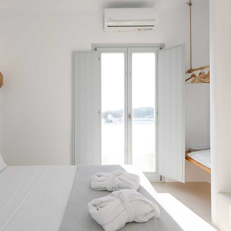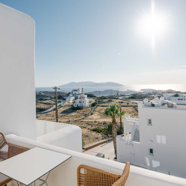 25m2 suite (with bedroom and living room) on different levels. Built in furniture, bathroom with shower, private veranda with a view of the traditional settlement Chora of Ios, the sea, or the pool.