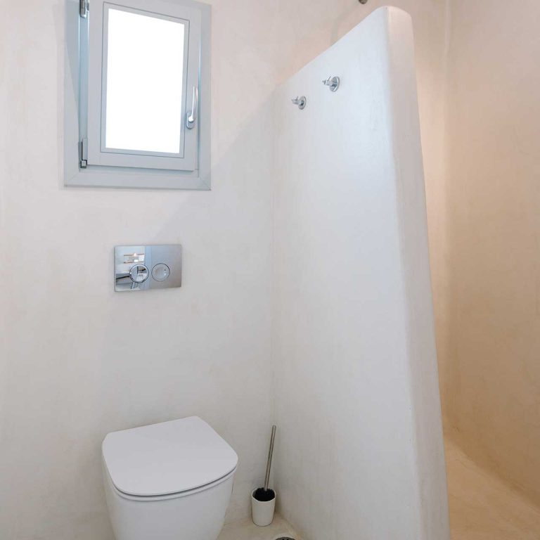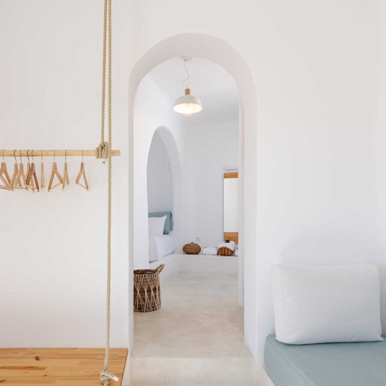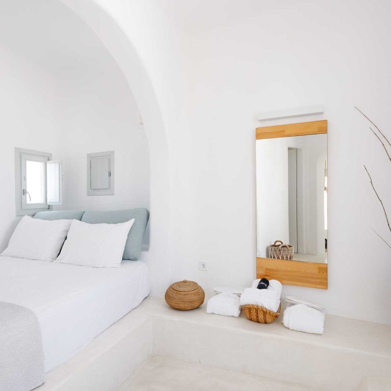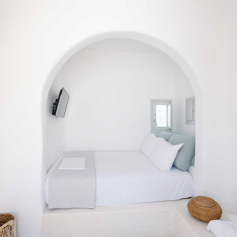25m2 suite (with bedroom and living room) on different levels. Built in furniture, bathroom with shower, private veranda with a view of the traditional settlement Chora of Ios, the sea, or the pool.